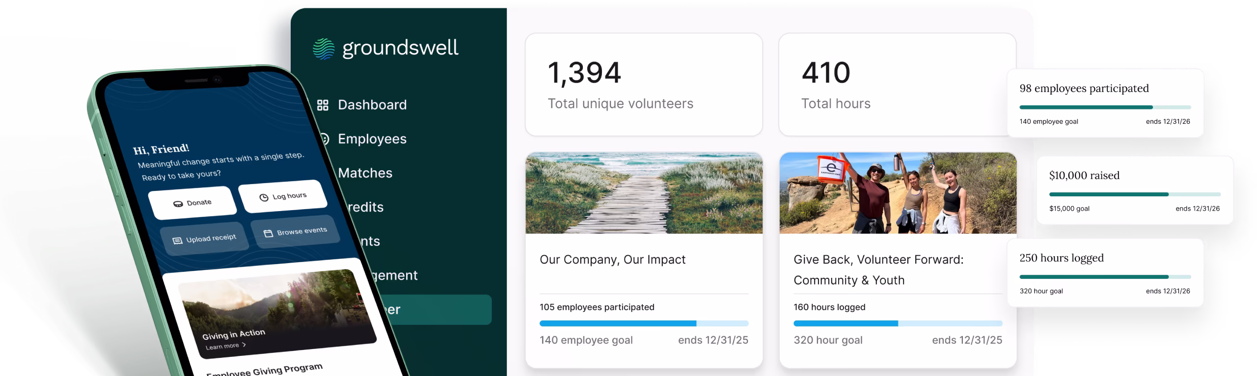 Groundswell is the only platform that seamlessly integrates your employee giving, volunteering, grantmaking, and employee assistance programs in one easy-to-use platform. One login for all your social impact needs from creation to reporting.